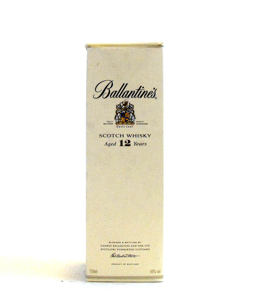 La caja de Ballantine’s 12 Años, un whisky escocés completamente madurado y embotellado en Escocia. (Solo la caja).
