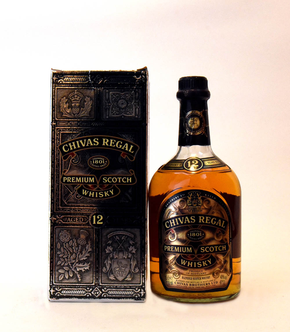 Un Chivas Regal 12 Años Premium Scotch Whisky, presentado en una caja con grabados intrincados que le dan un aspecto vintage y elegante.