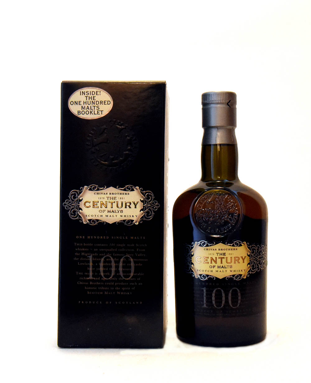 Un Blended Scotch Whisky “Century of Malts” de Chivas Brothers, una colección inigualable de 100 whiskies de malta, un tributo al espíritu de la destilería.