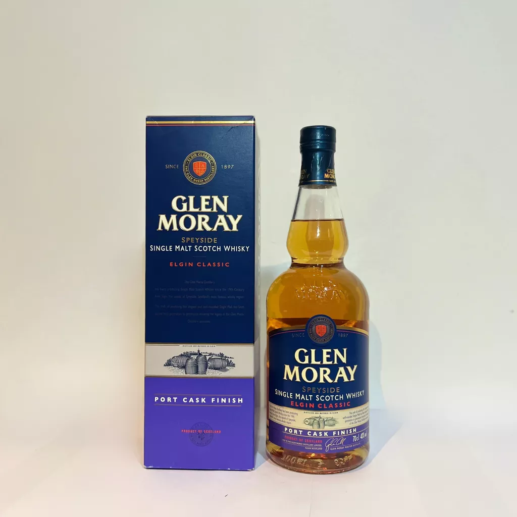El Glen Moray Port Cask Finish es un single malt de Speyside finalizado en barricas que previamente contuvieron vino de Oporto (Port). Este tipo de maduración aporta un perfil intenso en frutas rojas y una dulzura elegante que complementa muy bien el carácter suave de la destilería.