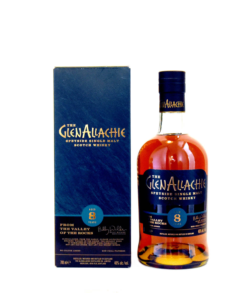 Un Speyside single malt de 8 años, embotellado por The GlenAllachie, con el distintivo “From the Valley of the Rocks”.