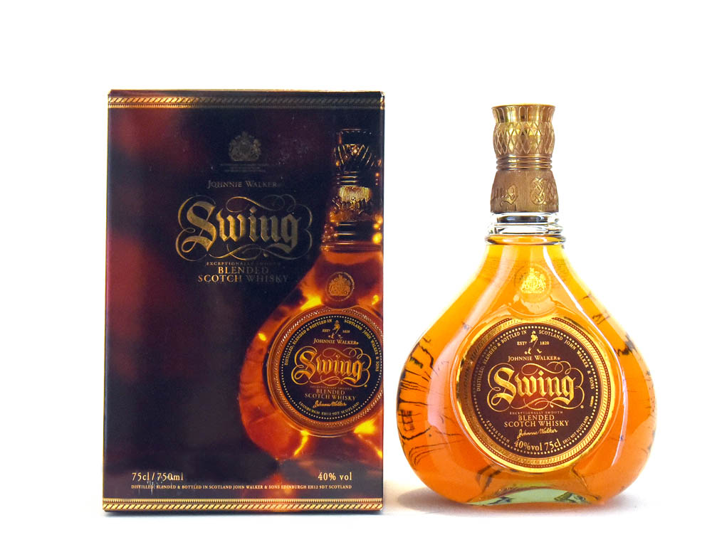 Un excepcional Blended Scotch Whisky “Swing” de Johnnie Walker, conocido por su botella con base de balancín y su mezcla de whiskies de lujo.