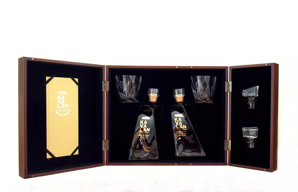 Un set de lujo de Kavalan, con dos botellas Solist Sherry Cask y vasos de whisky. Un regalo perfecto para los amantes de las rarezas.