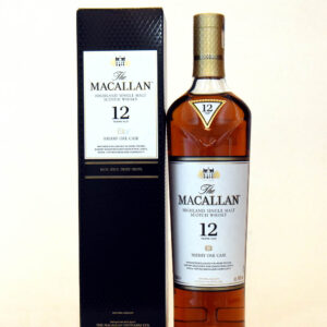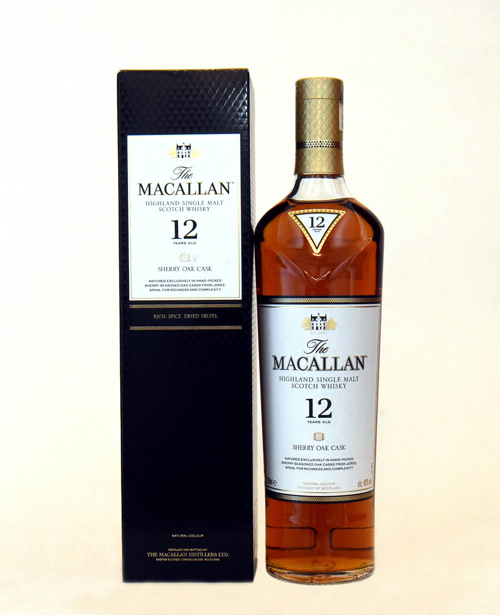 Un Macallan Highland single malt de 12 años, madurado exclusivamente en barricas de roble sazonadas con jerez, ofreciendo un sabor rico en especias y frutas secas.