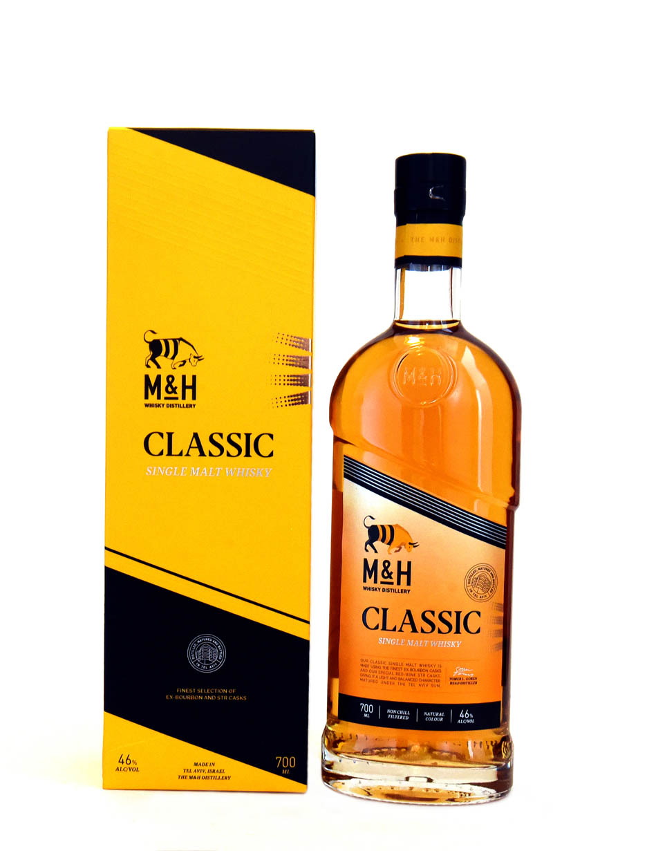 M&H Classic Single Malt Whisky de la destilería Milk & Honey de Tel Aviv, Israel, con una fina selección de barricas de ex-Bourbon y STR, ofreciendo un whisky equilibrado y accesible.