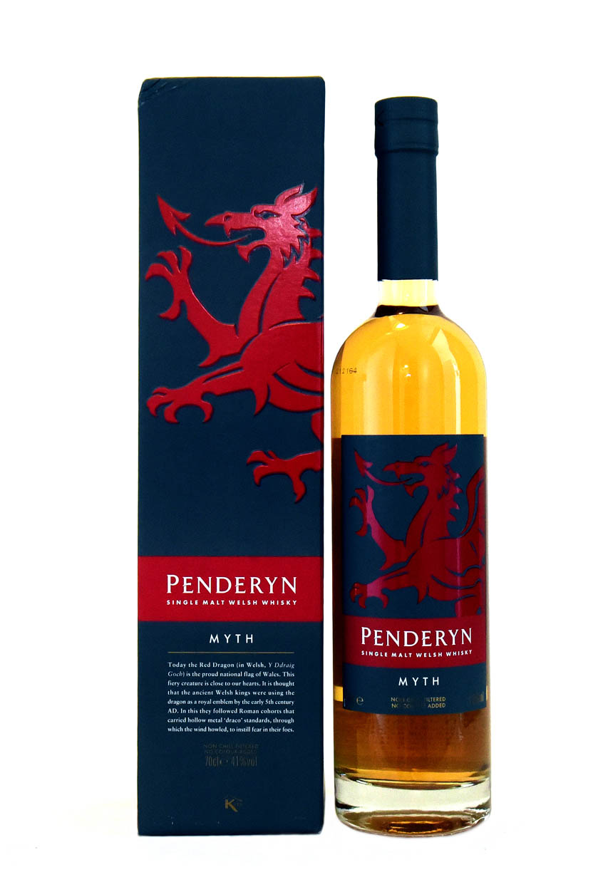 Penderyn Myth, un single malt Welsh Whisky que lleva el emblema del dragón rojo, un símbolo galés, con un perfil de sabor legendario.