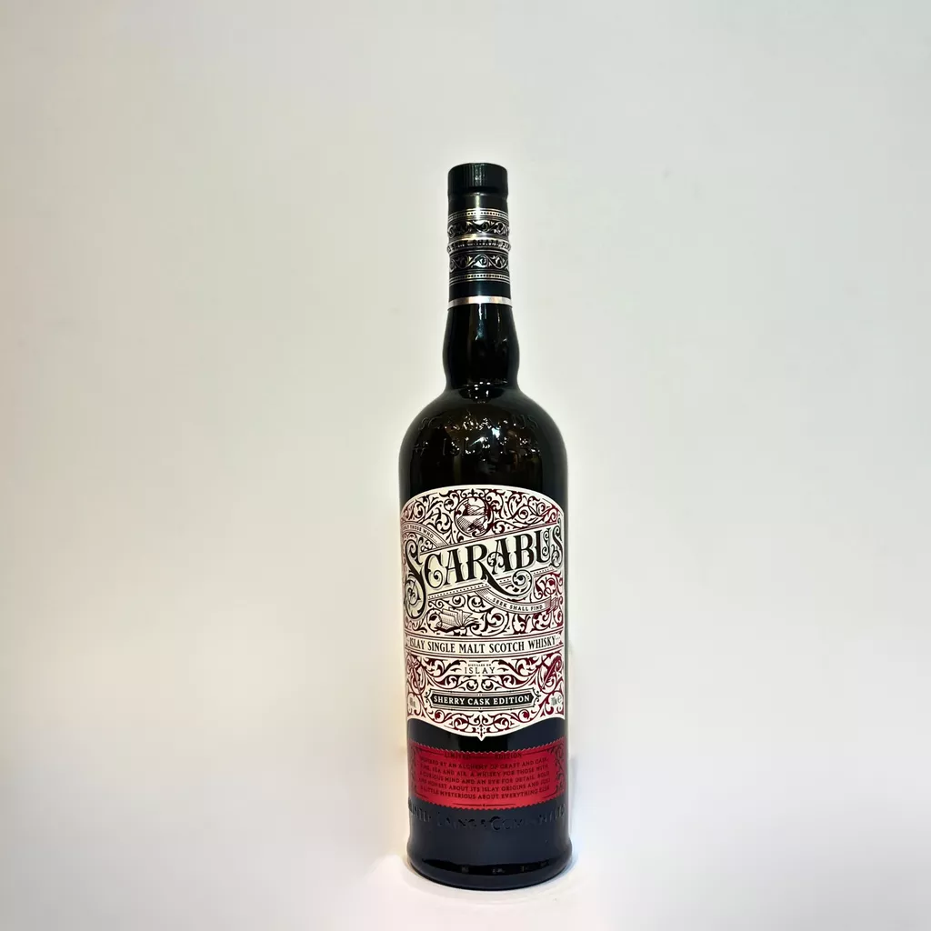 Scarabus Sherry Cask es un single malt escocés de la isla de Islay, embotellado por Hunter Laing, que combina la intensidad característica de la turba con la riqueza y dulzor aportados por barricas de jerez de primer llenado. Se trata de una expresión moderna que mantiene el misterio sobre la destilería de origen, resaltando el carácter salvaje y marítimo típico de Islay.
