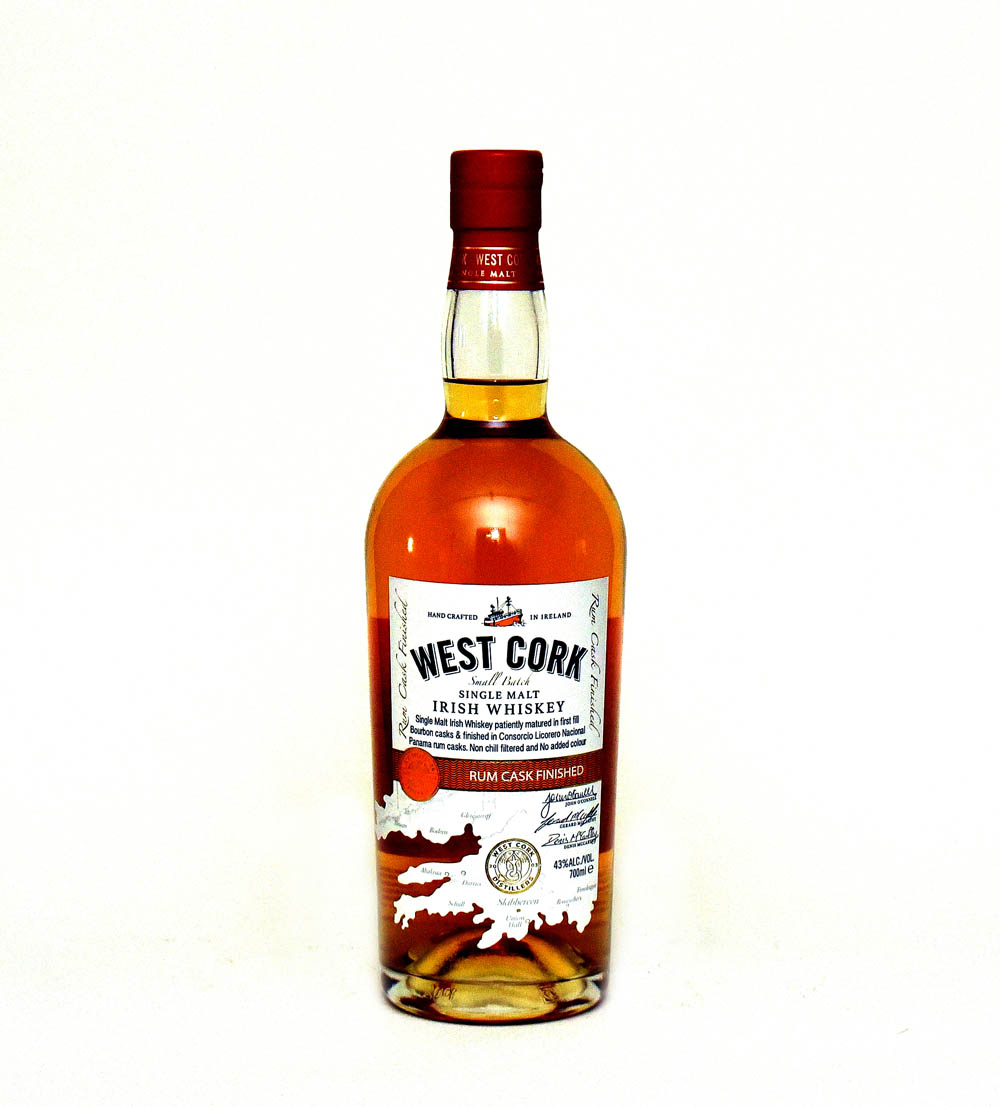 West Cork Small Batch Rum Cask Finished, un Single Malt Irish Whiskey artesanal madurado pacientemente y terminado en barricas de ron de Panamá, sin filtrar en frío y sin colorantes.