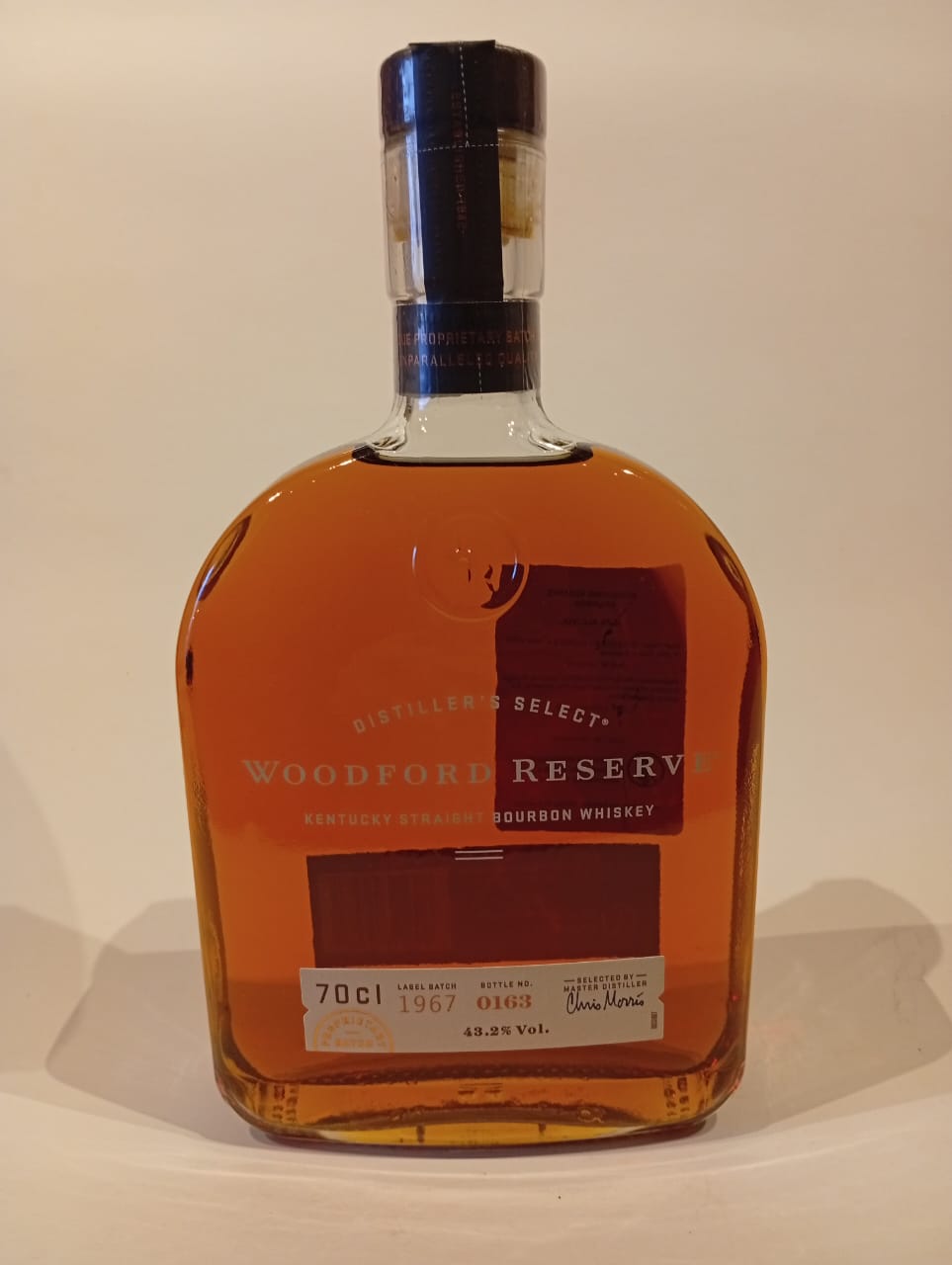 Un Kentucky Straight Bourbon Whiskey “Distiller’s Select” de Woodford Reserve, conocido por su equilibrio y su carácter complejo.